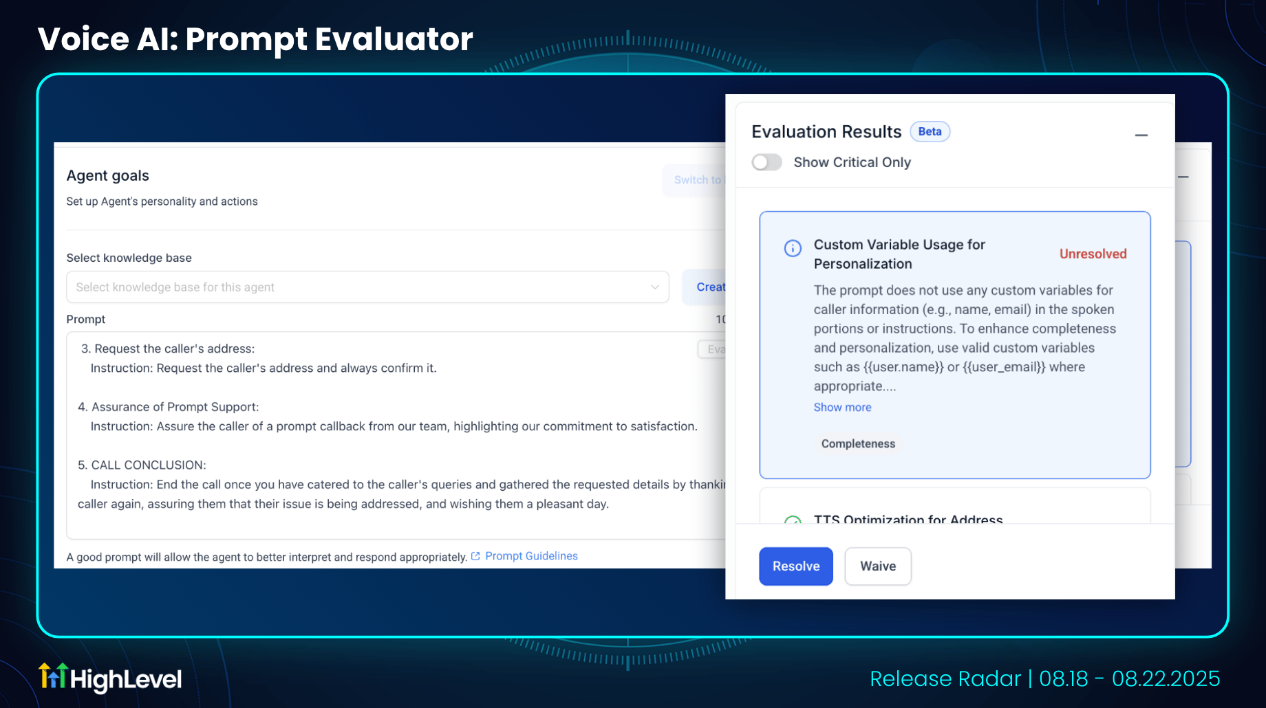 Instantly evaluate your Voice AI agent prompts, receive actionable suggestions, and address feedback for better results.