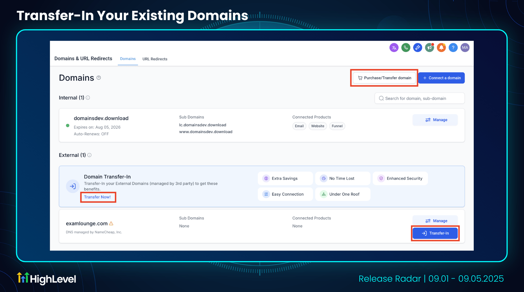 Allows transfer of domains from registrars like GoDaddy, Namecheap etc directly into HighLevel.