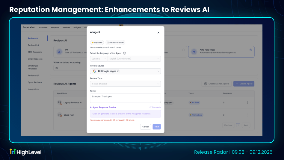 Granular Permissions – Agencies remain in control but can now grant locations the ability to create and edit their own Reviews AI Agents. By default, this option is disabled, so agencies decide who gets access.